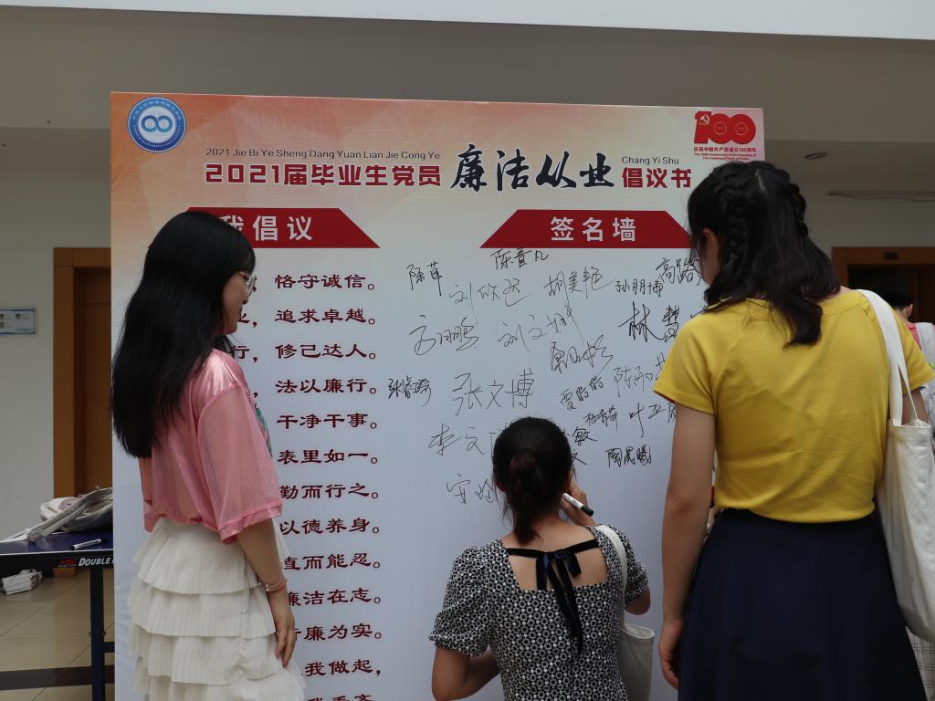 会议结束后,全体毕业生党员在张老师的带领下前往一楼大厅,在“廉洁从业”倡议签名墙上郑重地签下自己的名字,并与党旗合影留念。
