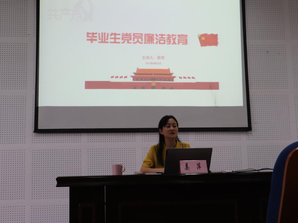 随后,姜萍为全体毕业生党员上了一堂以廉洁教育为主题的特殊党课,她从何为廉洁、廉洁教育的意义和如何做到廉洁自律三个方面,帮助毕业生党员形成正确的价值观和人生观,培养廉洁意识,希望毕业生党员在以后的工作岗位上时刻牢记廉洁人生的承诺,选择廉洁人生路。