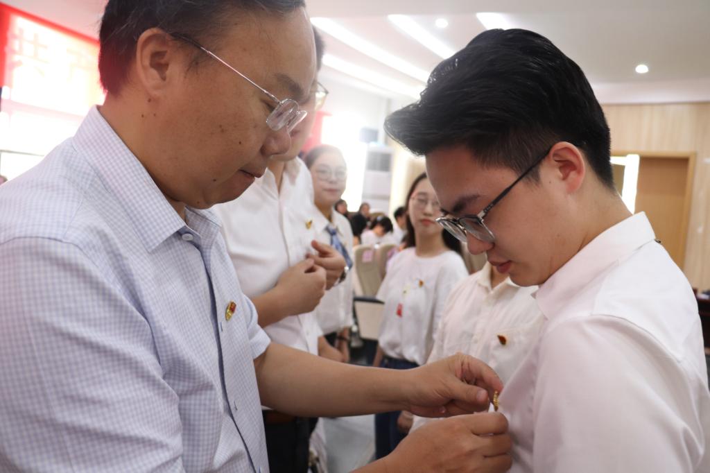 一名党员一面旗帜,一枚党徽一份责任。大会现场,老党员代表为9名新发展党员代表佩戴党徽。宁波市教育系统先进基层党组织研究生党支部李超凡同志带领全体党员宣誓,重温入党誓词。一句句誓词掷地有声、动人心魄,坚定了共产党员的初心使命,激励着全体党员保持奋斗精神,继续在PG官方直营网