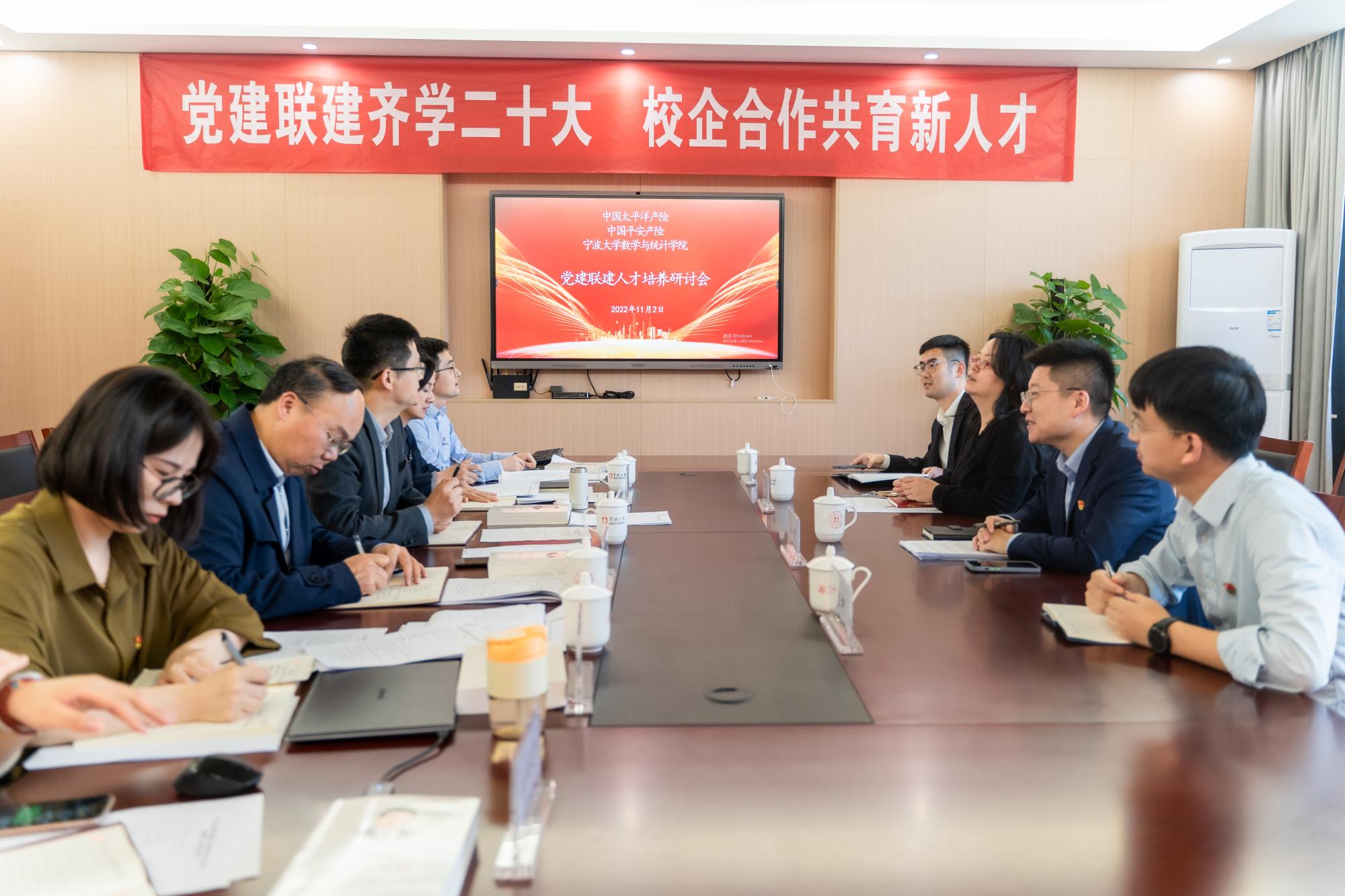 党建是第一责任,人才是第一资源。高校党建工作与创新人才培养关系密切,党建工作是创新人才培养的扎实后盾。为加强党建对创新人才培养的推动作用,助推校企合作,11月2日,PG官方直营网 与太平洋产险宁波分公司、平安产险宁波分公司开展党建联建人才培养研讨会,旨在“齐学二十大,共育新人才”,联合打造校企党建引领人才培养新模式。