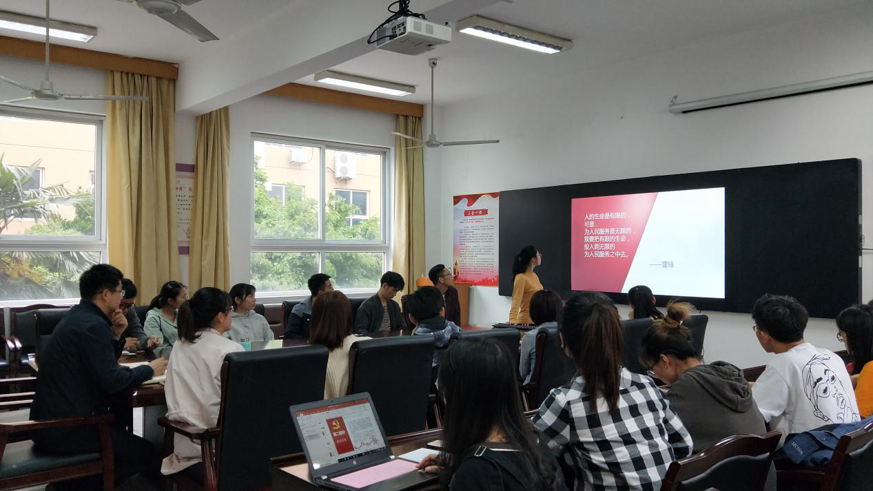 党员发展工作中心的代表,同时也作为数学师范班的同学,讲述了与自身日后的事业有关的感动中国十大人物的乡村教师张玉滚的事迹,十七年如一日的对学生的教导为我们传递了无私奉献的精神力量;数学第一支部数师班代表王高磊同学为我们介绍了屠呦呦女士与钱学森先生充满爱国奋斗精神的优秀事迹,只有不忘初心,牢记使命,才是当代青年有所作为的秘诀,才能够更好的实现自己的人生价值。