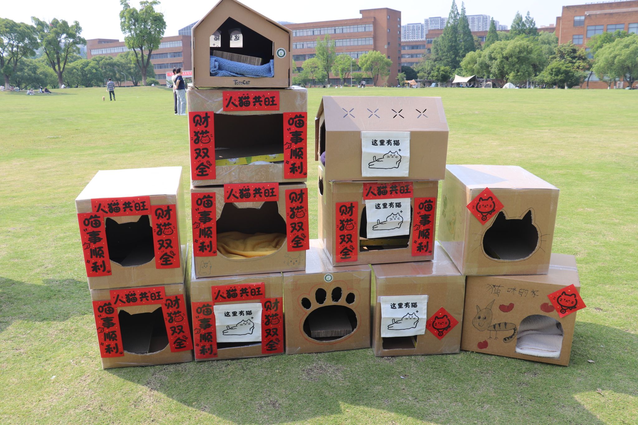 东校区大草坪构筑起10座创意猫屋,为流浪猫群搭建起温暖防护网。