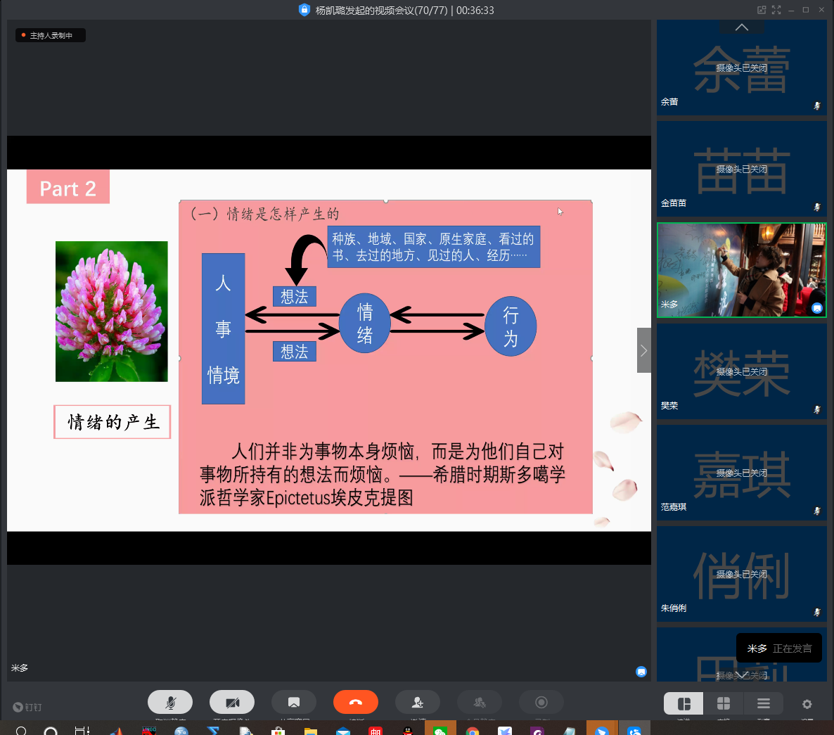 讲座围绕"身心的成长 一生的财富”主题展开,第一环节米老师介绍了在疫情期间容易出现的一些心理问题和如何去调节长时间居家在线学习出现的心理危机。详细介绍后,同学们结合自己的情况向米老师现场互动咨询,米老师都一一做出详细的解答。第二环节吕泽慧分享了居家期间可以做的居家运动以及相关注意事项,并与同学们积极互动讨论,气氛热烈。在活动最后,与会同学们现场参与了健康知识小竞答。