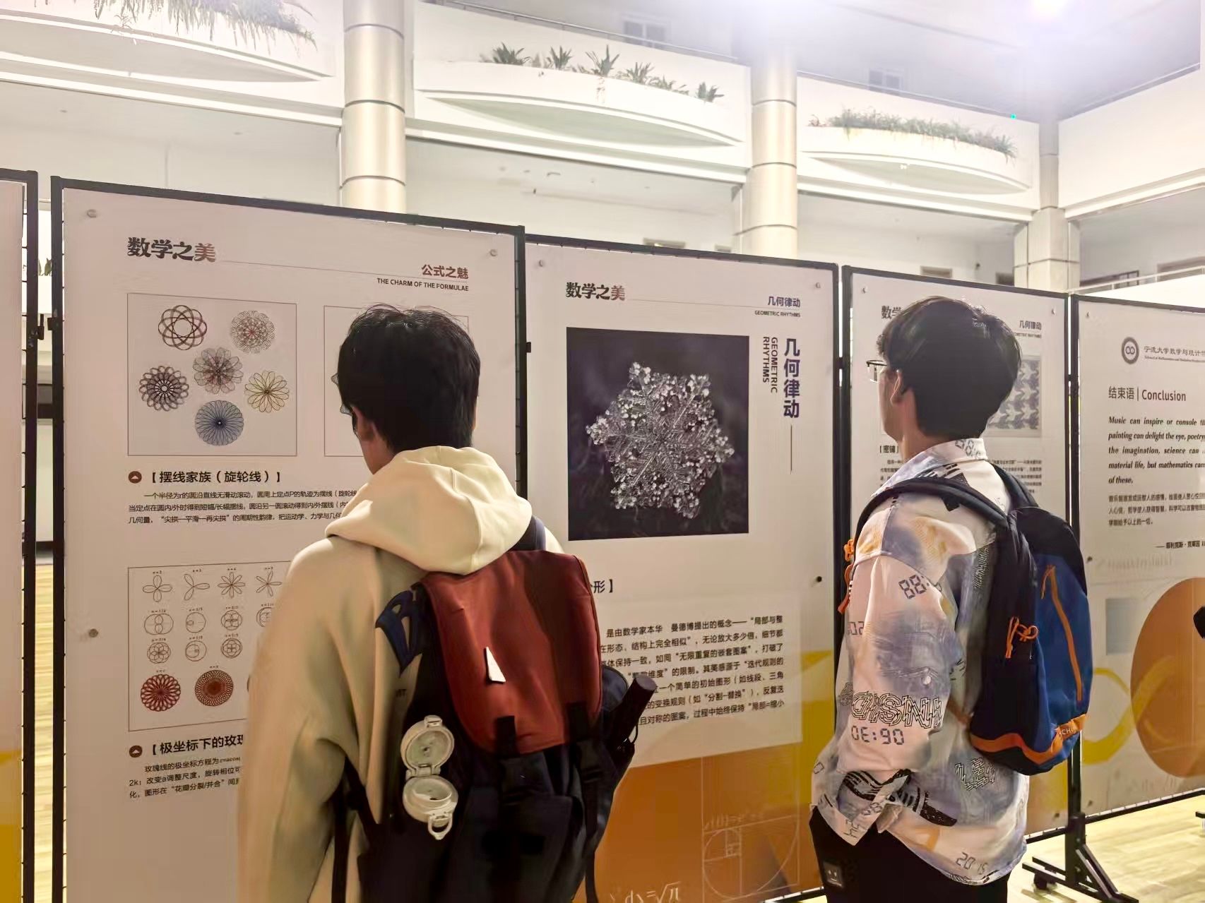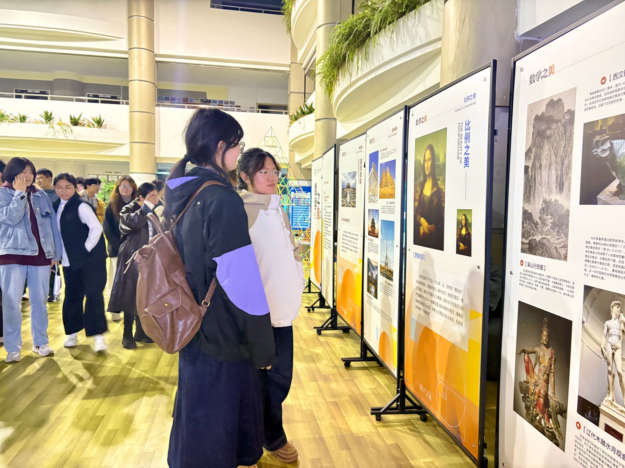 精心策划的“数学之美特展”精彩亮相。展览以“以数启美,以文化人”为主题,通过图文展板、实物模型与互动游戏相结合的形式,将抽象的数学知识转化为直观的美学体验,吸引了校内外师生、校友及市民驻足参观,成为建校纪念周系列活动的一大亮点。