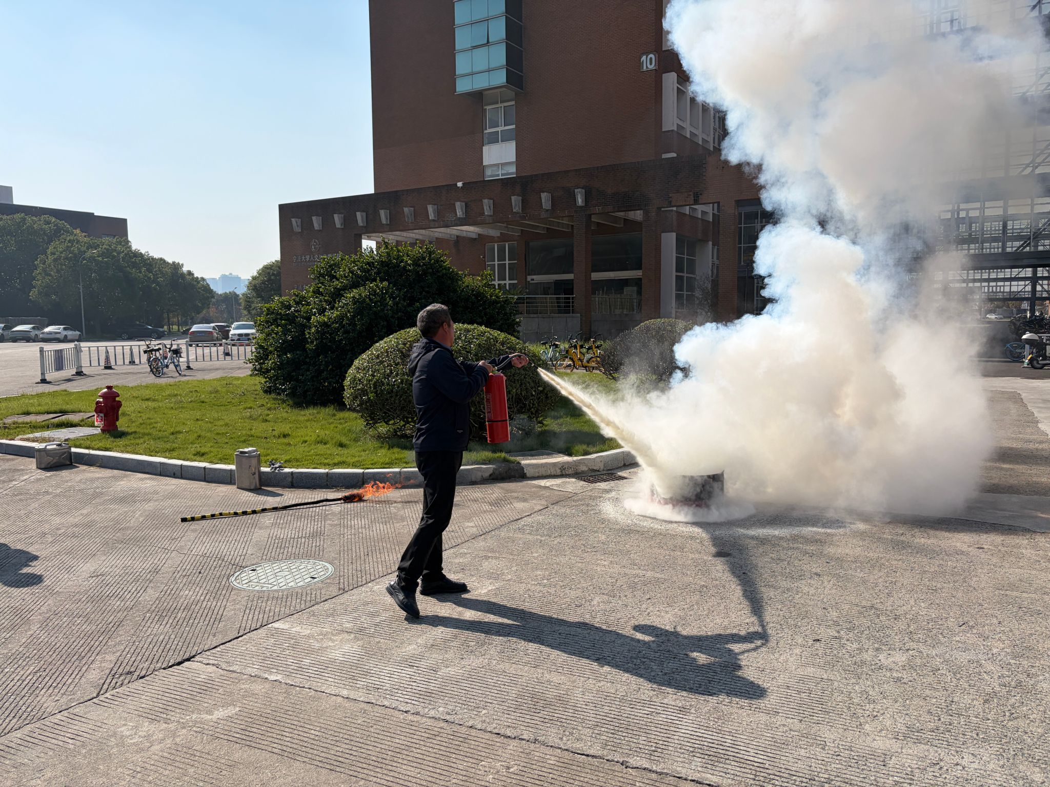 实践灭火环节的到来,瞬间点燃了全场的热情。在专业人员的严密监护下,师生们摩拳擦掌,跃跃欲试。他们勇敢地走上前,沉稳地提起灭火器,利落地拔掉保险销,坚定地握住喷管,果断地压下压把——将课堂所学的“提、拔、握、压”四字要诀迅速转化为精准有力的行动。这亲手扑灭火焰的体验,不仅让师生们扎实掌握了灭火器的操作技能,更让他们切身感受到防范于未然的沉重分量和临危不惧的巨大力量,极大地提升了应对火灾险情的实战自信与处置能力。