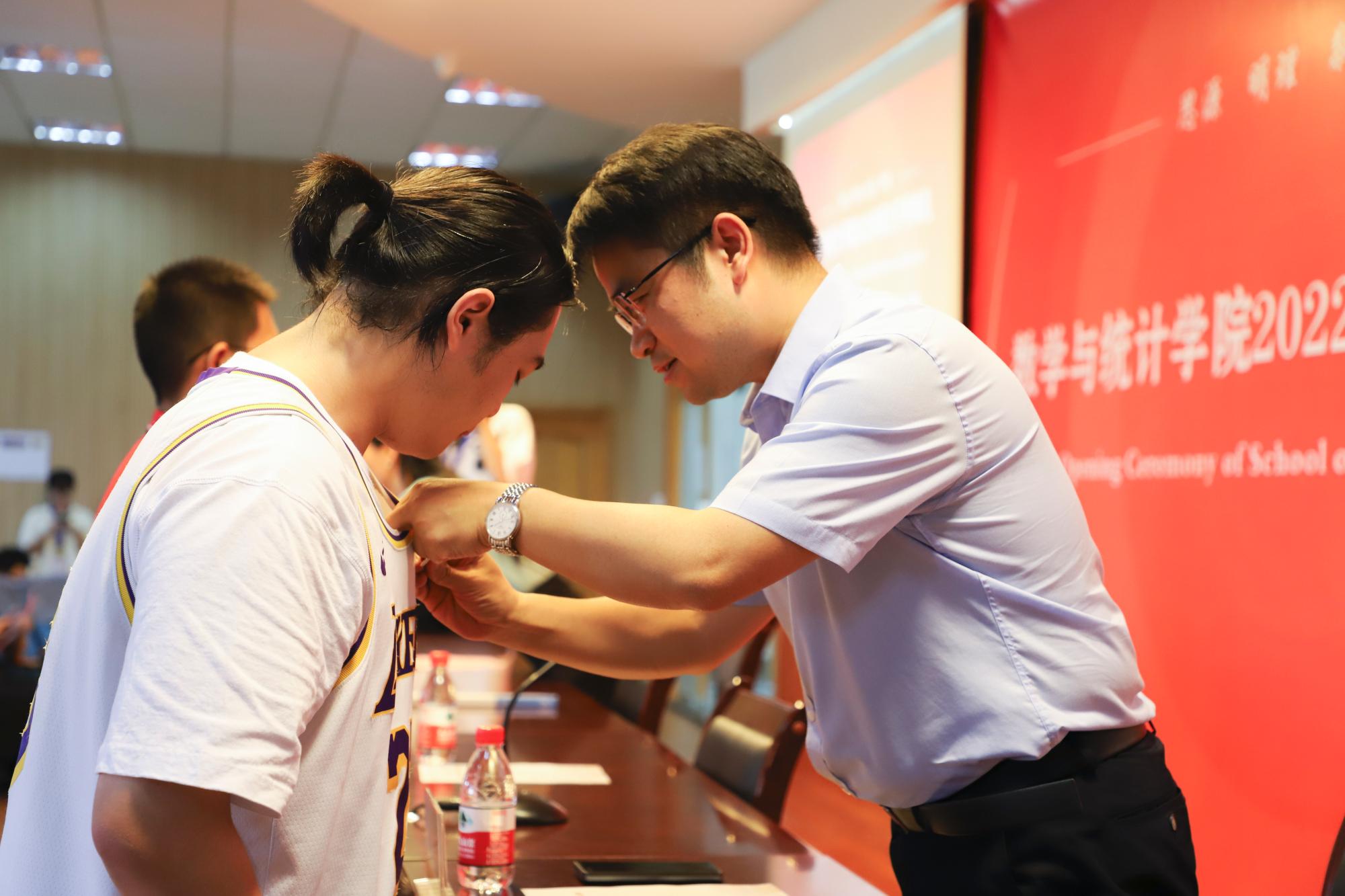 开学典礼在全场庄严的奏唱国歌中拉开了帷幕。首先,来自2022级数学与应用数学(拔尖人才创新班)的盛逸来同学作为本科新生代表上台发言,他讲述了自己选择数学的原因——对数学理性严谨真理的沉醉和对数学发自心底的热爱,并激励同学们要刻苦学习。接着研究生新生代表魏庚辰同学进行发言,他作为本科也在宁大的一名学子,在表达对数院浓厚学术氛围的赞叹的同时,也不忘为新生们提出“明确目标,自主创新”、“博采众长,厚积薄发”、“修身立德,志存高远”的倡议。之后,由院领导给新生代表们佩戴校徽,成为一名正式的数学人。