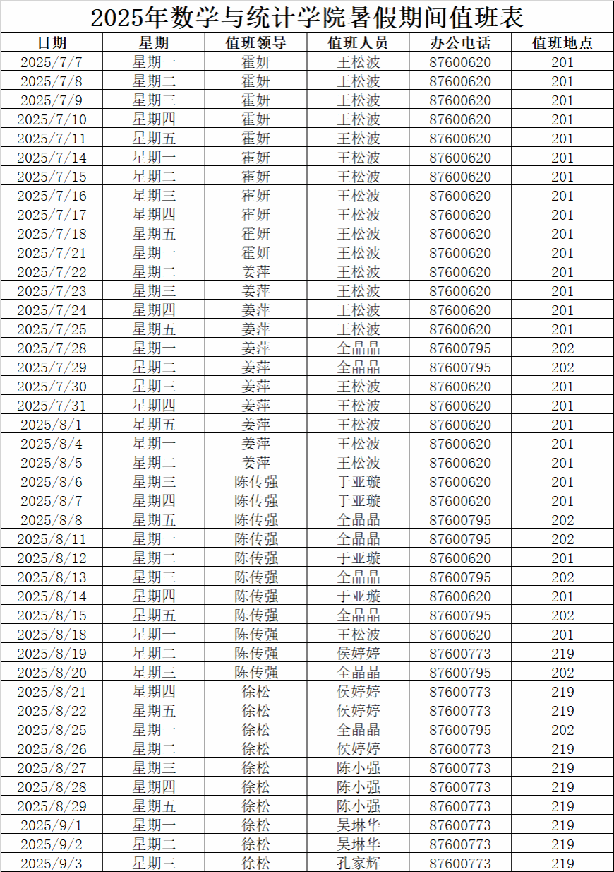 根据《PG官方直营网 校长办公室关于2025年暑期轮休及工作安排的通知》中的安排,要求值班人员坚守岗位,履职尽责,做好值班记录,确保各项工作有序运转。值班时间为每天8:30-16:00。具体安排如下:
