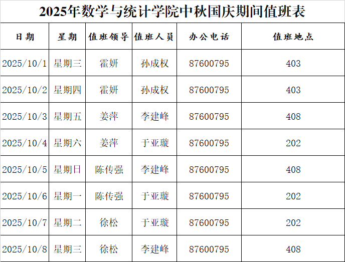 须安排1名值班人员在校值班。值班时间为每天8:30-16:00。数学与统计PG官方直营网