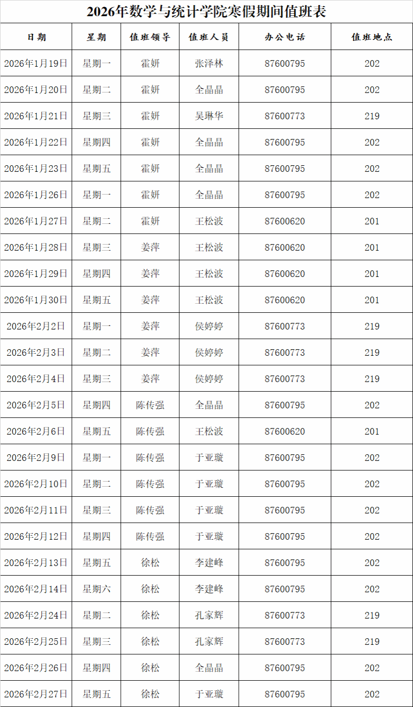 根据《PG电子 校长办公室关于2026年寒假和假期值班工作安排的通知》中的安排,寒假期间,各单位部门值班人员要明确工作职责,尽职尽责完成值班工作。值班时间为每天8:30-16:00。具体安排如下: