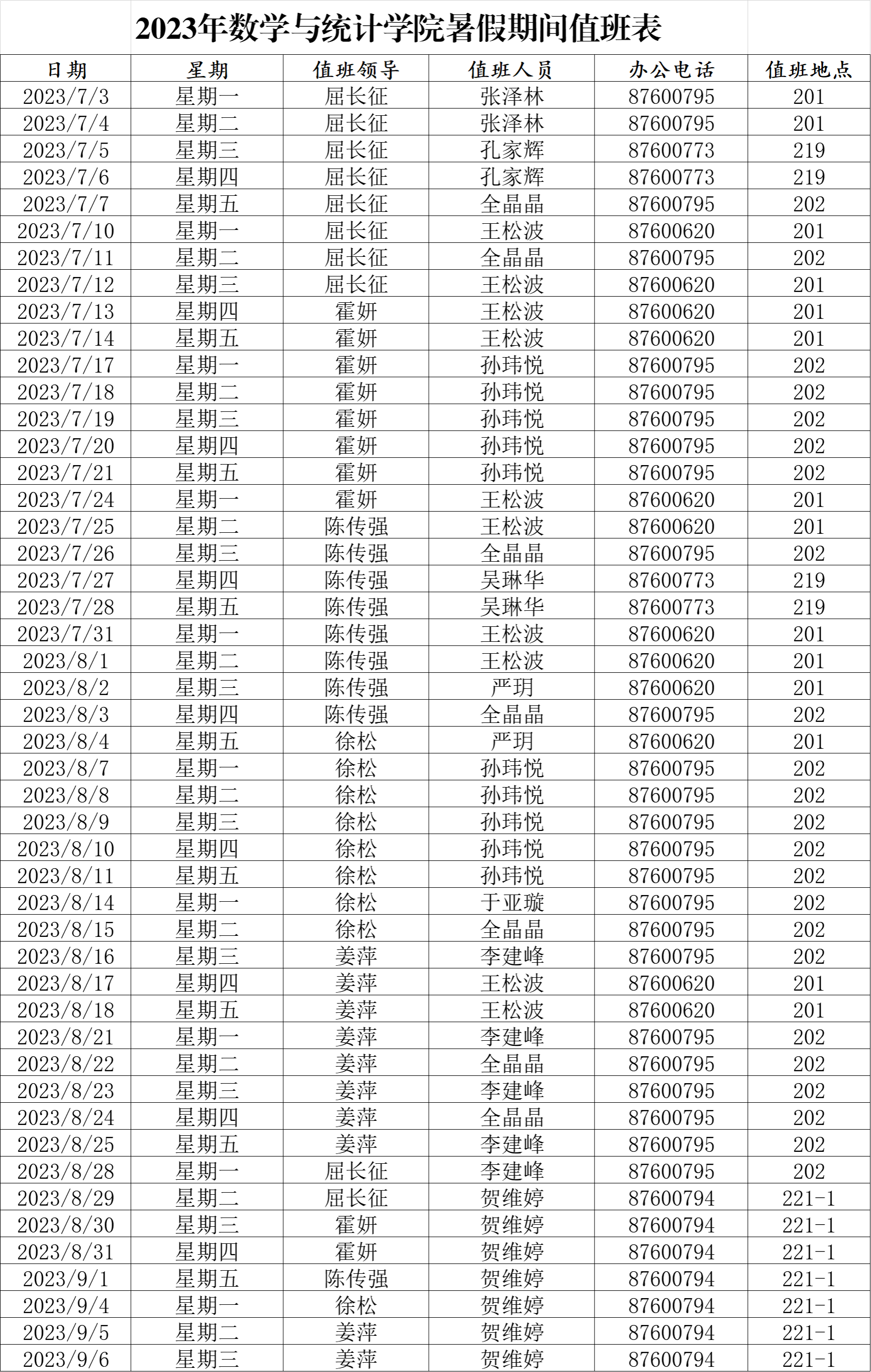 根据 “PG官方直营网 校长办公室关于2023年暑期轮休及工作安排的通知”的要求,要根据“不误办事”的原则,安排好假期值班人员,确保周一至周五每天有人值班,值班时间为每天8:30-16:00。数学与统计PG官方直营网 2023年暑期值班安排如下:
