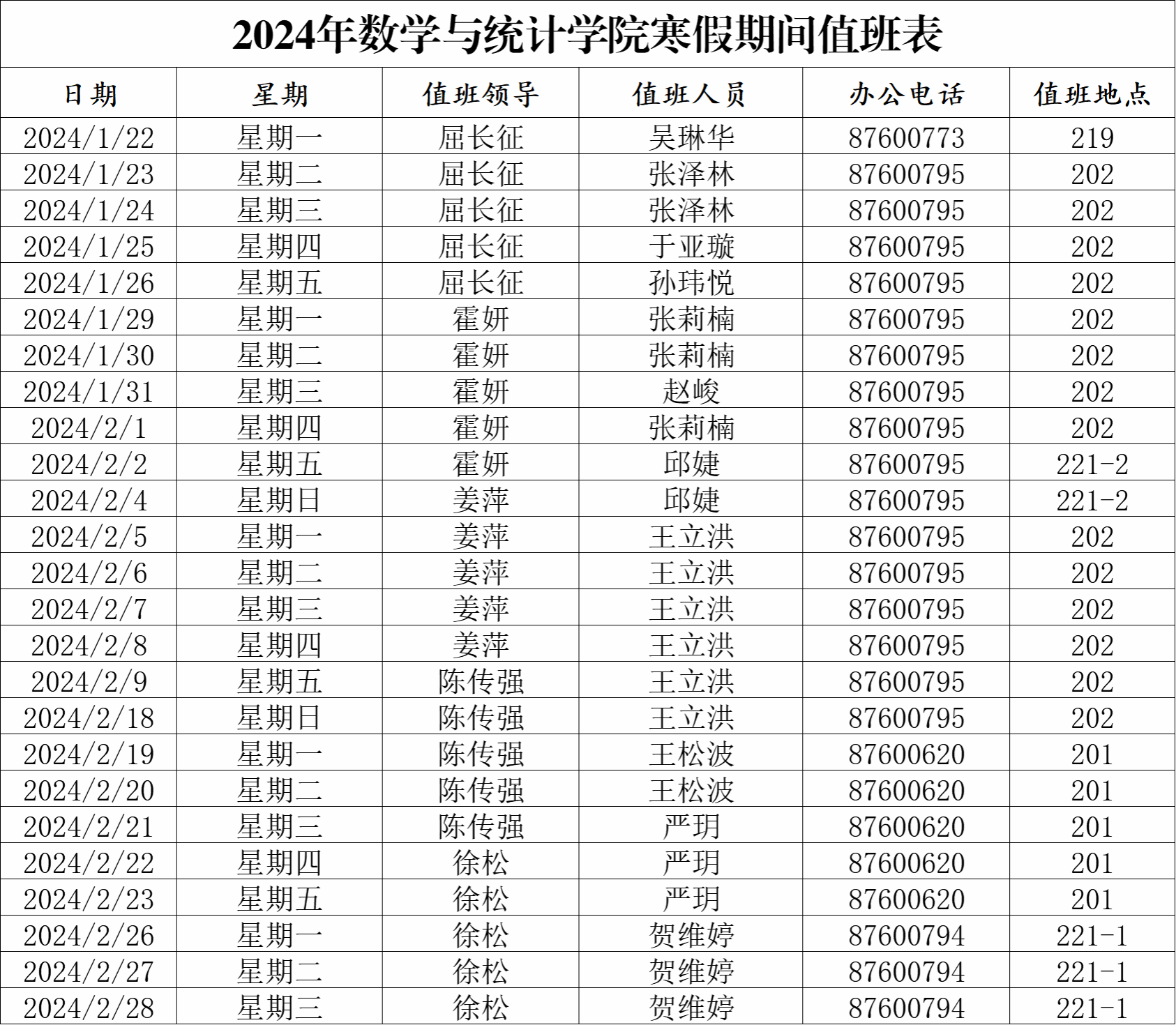 按照《PG官方直营网 校长办公室关于2024年寒假和假期值班工作安排的通知》中的安排,要根据“不误办事”的原则,安排好假期值班人员,确保工作日(农历正月初一至初八除外)有专人值班,值班时间为每天8:30-16:00。数学与统计PG官方直营网 2024年寒假值班安排如下: