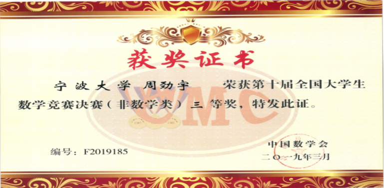 数学与应用数学(中美合作精算科学与风险管理)专业2016级本科生周劲宇同学参与角逐,最终荣获全国大学生数学竞赛决赛(非数学组)三等奖。