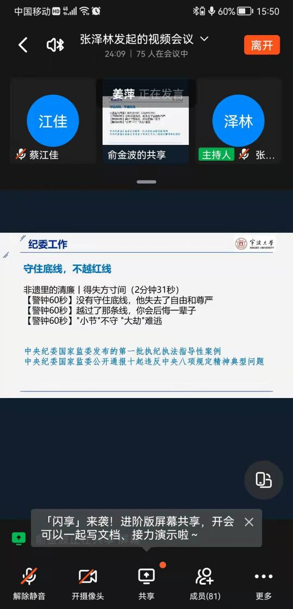 2021年12月14日,为了深入贯彻落实全面从严治党要求,进一步严明政治纪律和政治规矩,全面推进“清廉宁大”和“清廉PG官方直营网 ”建设,数学与统计PG官方直营网 利用钉钉会议线上开展以“坚守底线,不越红线”为主题的廉政专题学习会。会议由PG官方直营网 党委书记俞金波主持。